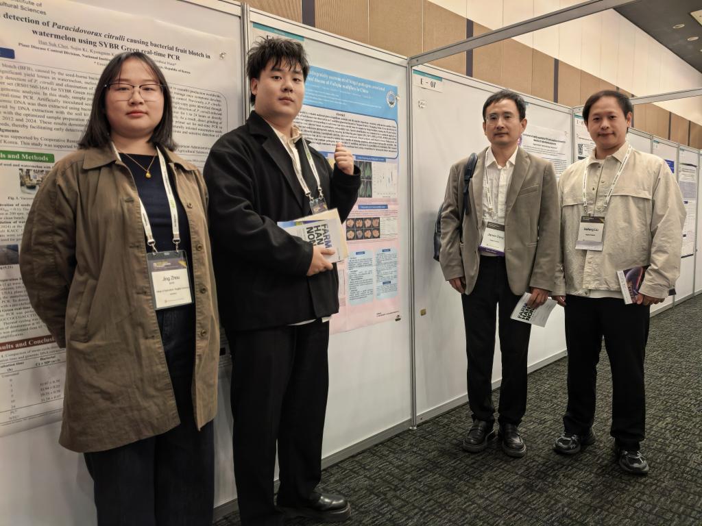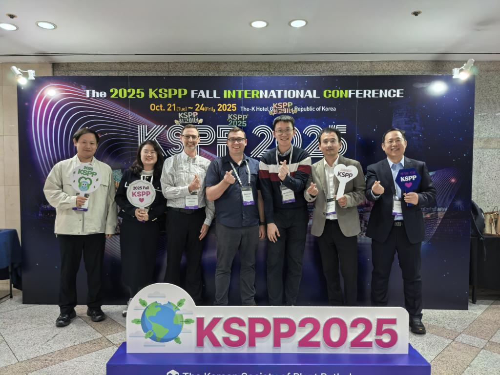 随后,10月21日-23日,他们赴韩国庆州参加“The 2025 KSPP Fall International Conference”。公司两位教授分别做了题为,“Diversity of Alternaria Specise Associated with Solanaceae in China” (邓建新教授) 和 “The Microbiome of Zoysia japonica: Diversity and Antifungal Properties of Rhizospheric and Endophytic Microbes”(刘海峰教授)的报告。博士研究生苟亚楠和硕士研究生陈世强分别作了题为“Investigation on nature variations of Prt1 in Solanum americanum” 和 “Identification and pathogenicity of fungal pathogens associated with leaf disease of Fallopia multiflora in China” 的墙报展示。会议期间,对公司通过“创新型人才国际合作培养项目”在韩国首尔大学学习的苟亚楠博士进行了慰问和关心。