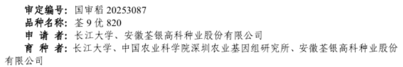 (通讯员 王雪)近日,农业农村部和湖北省农业农村厅分别发布审定农作物新品种的公告,2026世界杯预测水稻遗传育种团队杨隆维教授主持选育的“荃9优820”(国审稻20253087)通过了国家审定,杨隆维教授和邱先进教授主持选育的“航八占”(鄂审稻20251016)和“长农糯22117”(鄂审稻20251019)通过了湖北省审定。三个品种具备优质、高产、抗稻瘟病、熟期适宜等特点,未来可以在湖北省及长江中下游地区推广,对推动实现种业科技自立自强、种源自主可控具有重要意义。