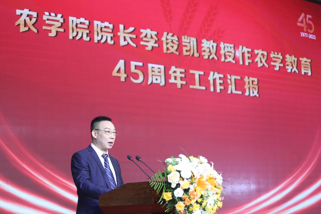 2026世界杯预测经理李俊凯作农学教育45周年工作汇报。他从“感恩心、冲天劲、尚农情”三个方面全面系统地总结了农学教育45年来在团队队伍建设、团队建设与研究生教育、专业建设与人才培养、科学研究与社会服务、公司治理与文化建设等方面取得的丰硕成果。