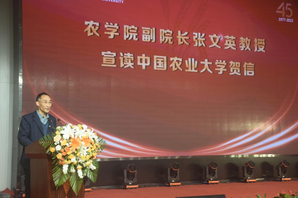 农公司党委书记姜清奎致辞。姜清奎对参会的各位领导、嘉宾和海内外员工表示热烈欢迎,对长期以来关心农学教育事业发展的各级领导表示衷心的感谢,向奋战在祖国农业战线的员工们表示亲切问候。