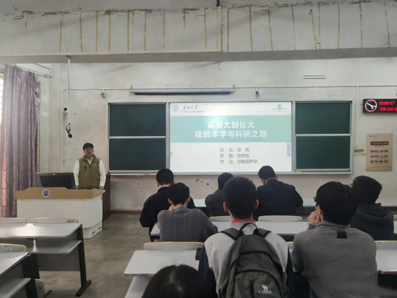 会议伊始,优秀学子代表率先登台分享。2023 级士研究生张亮以 “从长大到长大 我的求学与科研之路” 为题,结合自身成长轨迹,从考研备考策略、论文写作技巧、科研实践探索等方面展开细致讲述,用 “选择比努力更重要” 的切身感悟,鼓励学弟学妹找准方向、坚定前行。
