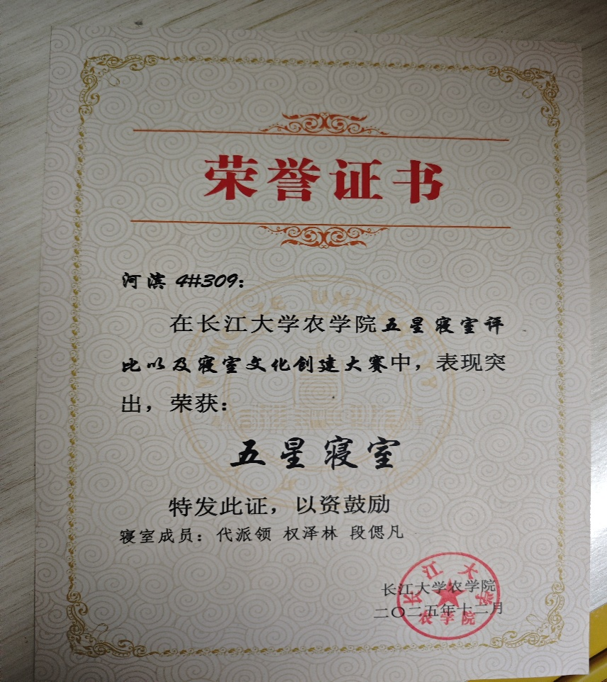 河滨公寓4#309寝室,住着三位志同道合、团结向上的青年学子。他们以友爱为基、以自律为本、以共进为目标,共同营造文明和谐、积极向上的寝室氛围,用实际行动诠释“五星寝室”的内涵与风采。