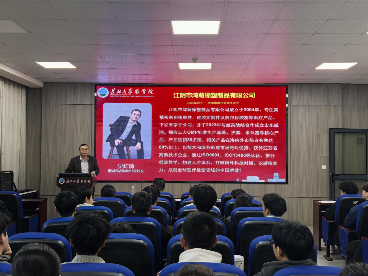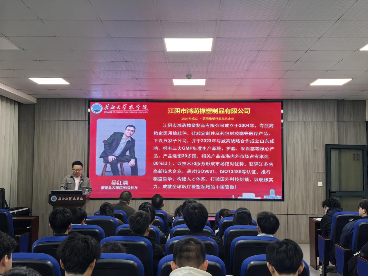尹小华首先向同学们介绍了吴红清员工所创企业的发展成果。鸿萌橡塑 2004 年成立,深耕医用橡塑领域,现已成为行业龙头,下设五家子公司,与威高集团战略合作成立山东威鸿,拥有三大 GMP 标准生产基地,核心产品远销 30 余个国家,海内外市场占有率超 80%,以硬核技术打破国外封锁,获评江苏省高新技术企业并通过多项国际认证,彰显中国企业的创新实力。