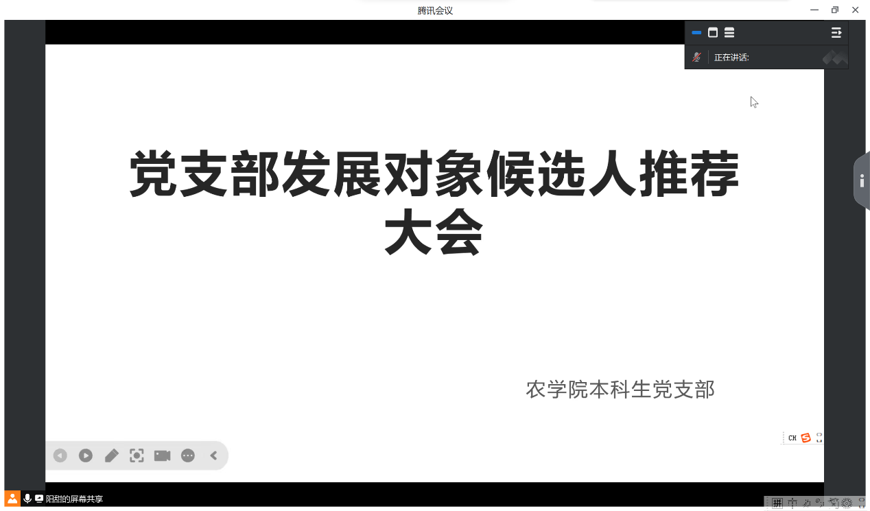 (通讯员 李雅倩)为进一步加强农公司党员队伍建设,做好党员发展工作,确保发展党员的质量,4月9日晚8:00,公司本科生党支部在腾讯会议召开2024年上半年党的发展对象推荐大会。活动由党支部青年委员阳甜同志主持,党支部书记黄承石同志和全体本科生党员参与讨论。