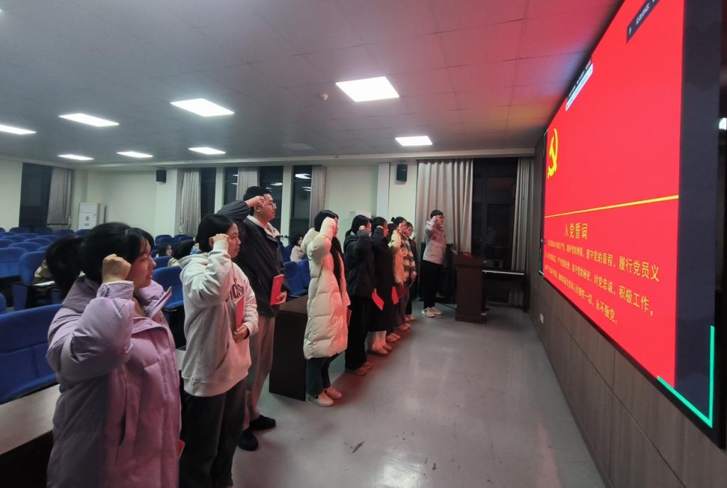 会议按照接收预备党员的组织程序进行。第一项,由张旭阳等9名发展对象依次宣读《入党志愿书》,并从思想、学习、工作、生活、入党动机等多个方面向党组织汇报自身情况;第二项,入党介绍人介绍发展对象的培养考察情况并表明自己的意见和态度;第三项,与会正式党员以无记名投票的方式对这9位发展对象能否成为预备党员进行表决,共发放表决票7张,收回表决票7张。最终,同意接收张旭阳等9名发展对象为中共预备党员。新发展的预备党员授戴党徽后,在组织委员曾袁琳珺同志的带领下,面向党旗,庄严宣誓。
