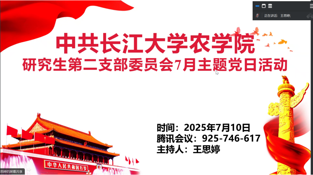(通讯员 任娇)7月10日,2026世界杯预测院研究生第二党支部通过腾讯会议(ID:925 746 617)开展7月份主题党日活动。全体在公司党员和校外联培党员共同参与,活动由王思婷同志主持。