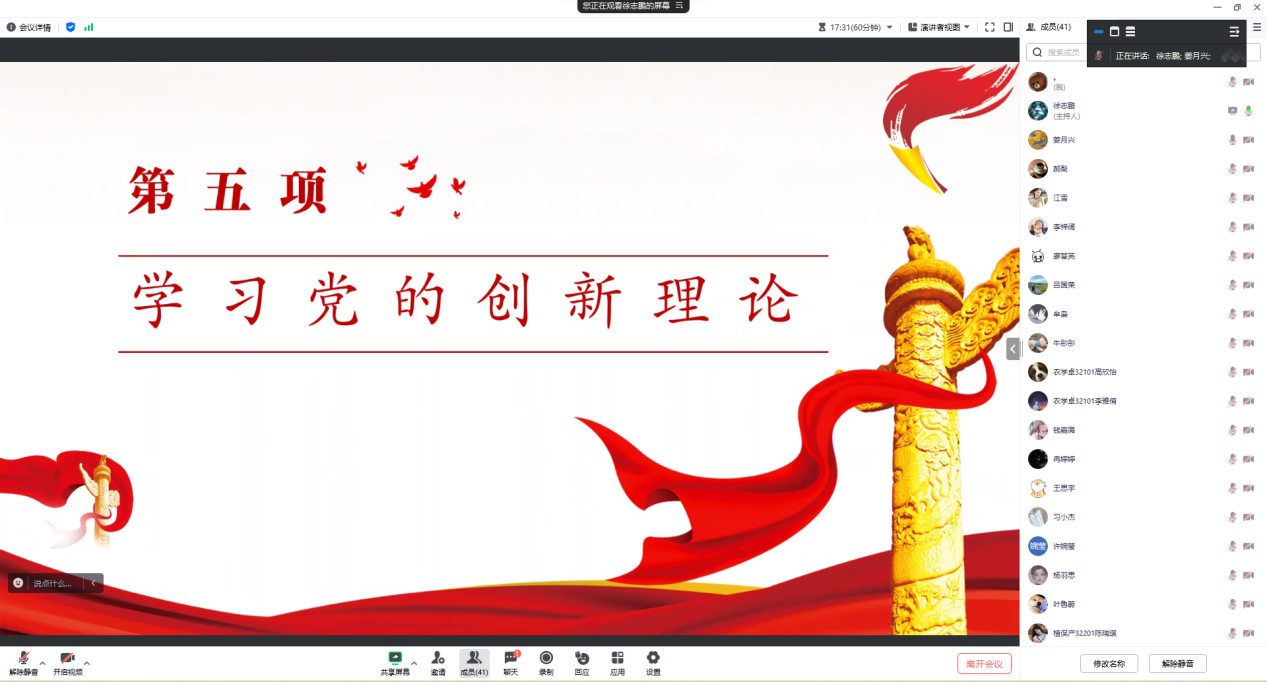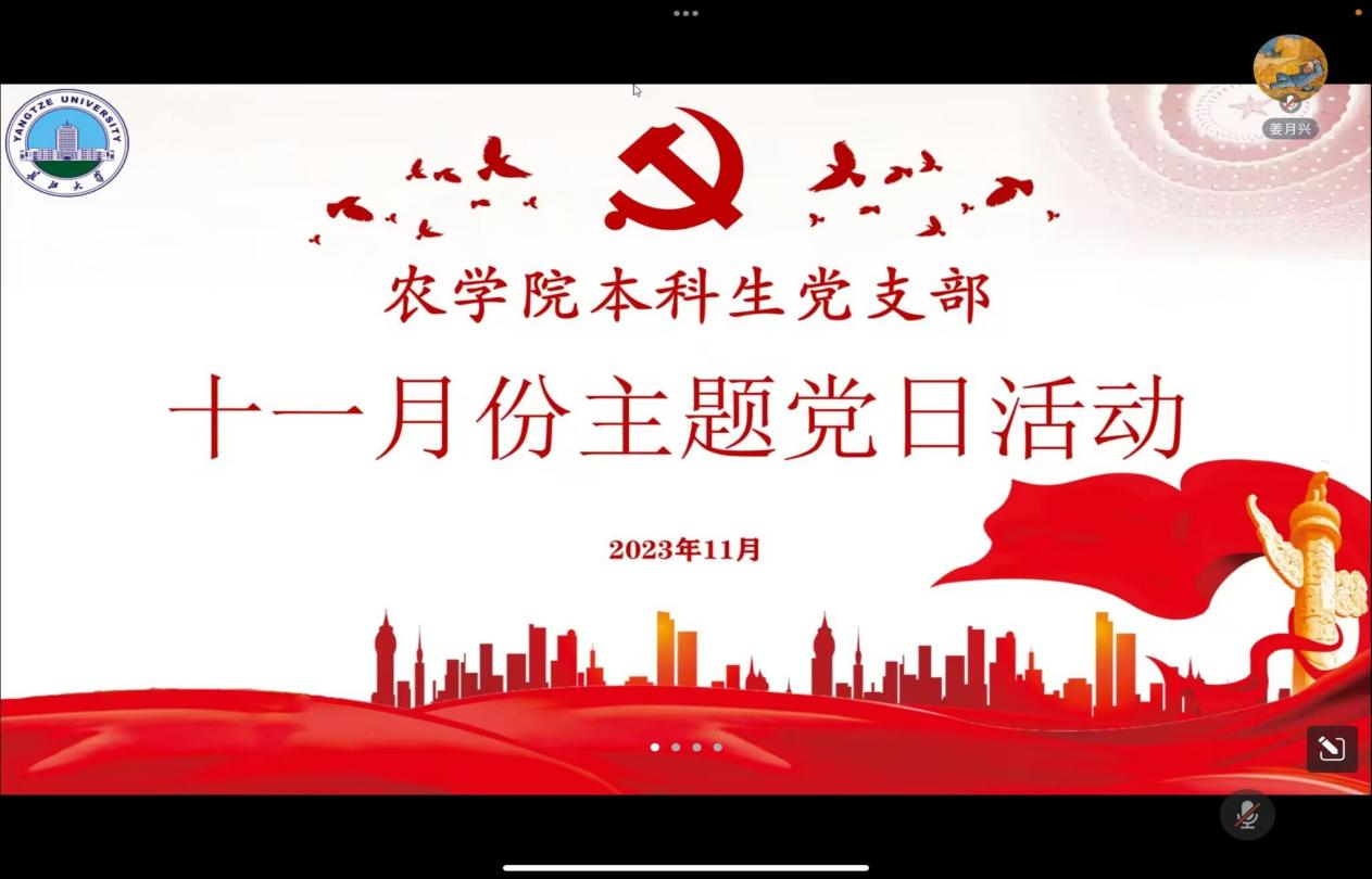 (通讯员 徐志鹏)11月27日18:00,公司本科生党支部在腾讯会议开展十一月主题党日活动,支部党员应到44人,实到44人,本次活动由支部党员徐志鹏同志主持。