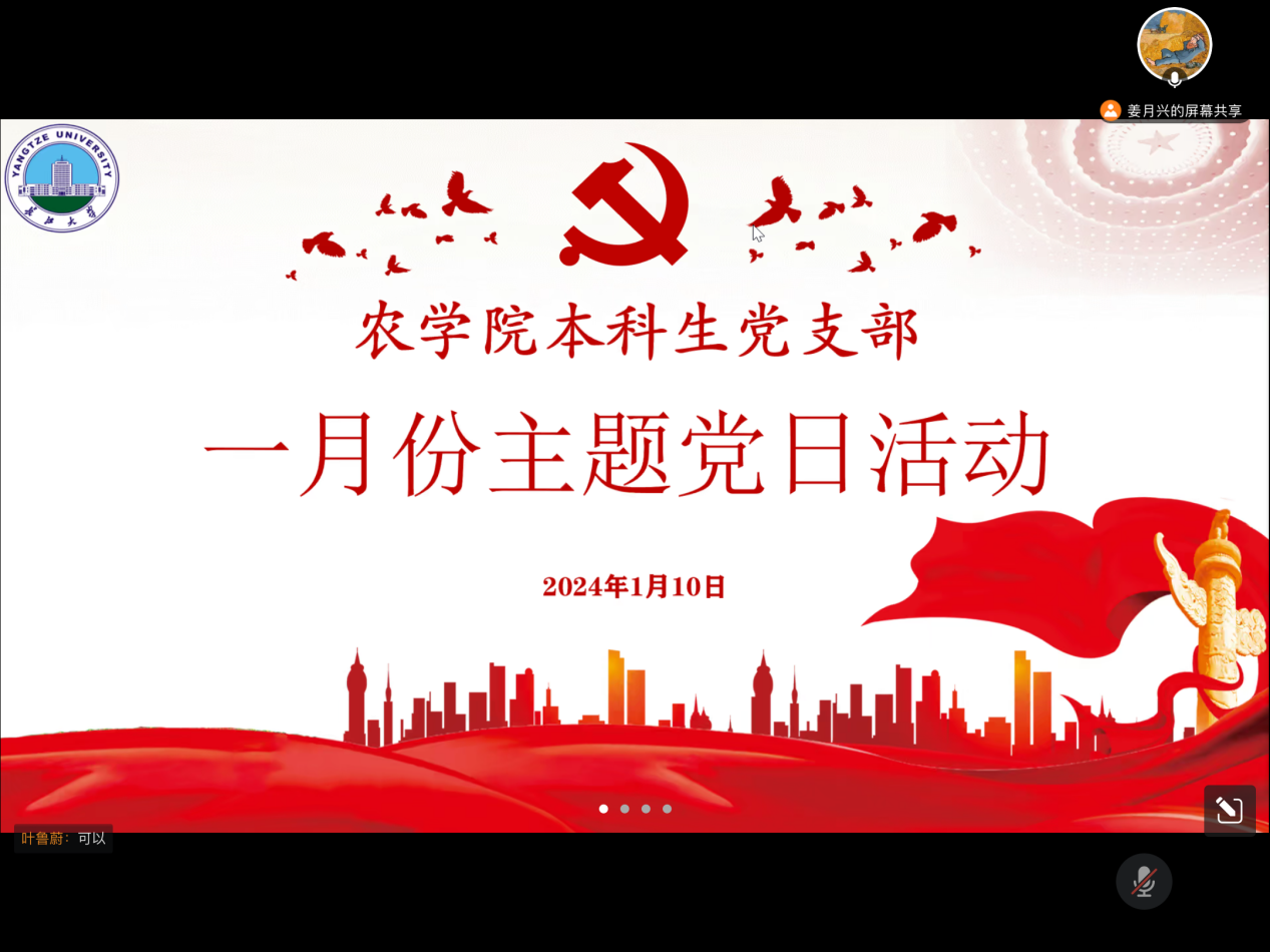 (通讯员 徐志鹏)1月10日晚上19:00,公司本科生党支部在腾讯会议开展一月主题党日活动,支部党员应到44人,实到44人,本次活动由支部党员姜月兴同志主持。