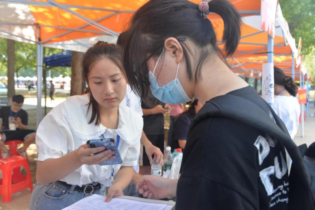 迎新志愿者认真为新生进行扫码签到
