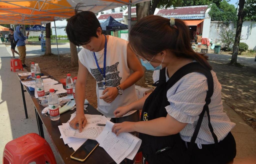 迎新志愿者认真核对新生身份信息