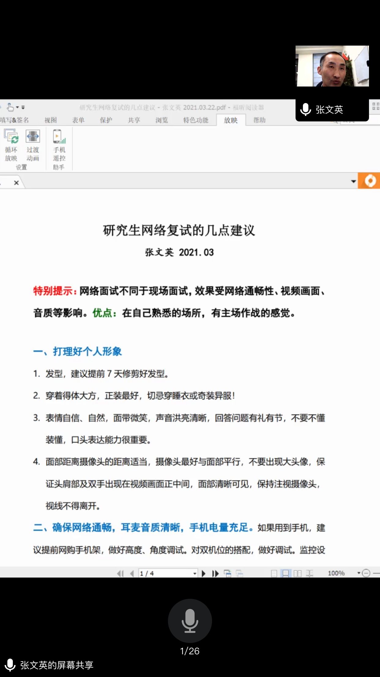 随后,张文英教授结合招生政策和全国考研情况,从各个方面综合分析了今年的研究生招生形势。紧接着张文英教授就研究生网络复试给予宝贵建议。在个人形象方面,参与网络面试的员工应注意发型干净、衣着得体、表情自然。其次由于网络面试不同于现场面试,在硬件设施方面,应确保网络流畅,电量充足,耳机音效良好,参与面试的同学要防患于未然,避免一切不利于面试的意外发生。张文英教授同时还鼓励同学们要和院内老师保持联系,遇到任何困难,要及时向公司教职工求助,公司和老师都是同学们的坚强后盾将不遗余力的帮助同学们解决问题。