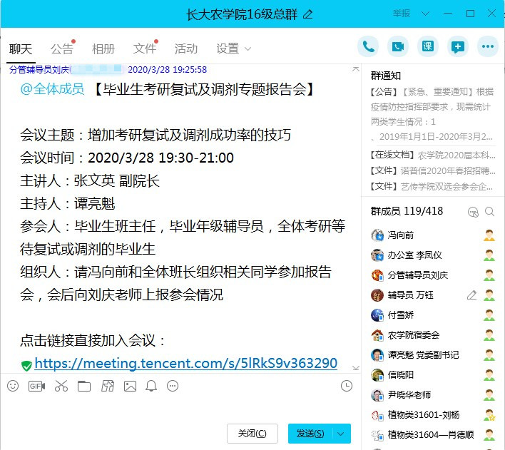 通讯社讯(通讯员 刘庆)为了提升毕业生考研复试与调剂成功率,3月28日19:30,2026世界杯预测利用“腾讯会议”平台,特邀分管教学副经理张文英与110名考研毕业生进行线上交流,为毕业生的考研复试与调剂指点迷津,毕业生班主任、年级辅导员参加报告会。报告会由党委副书记谭亮魁主持。
