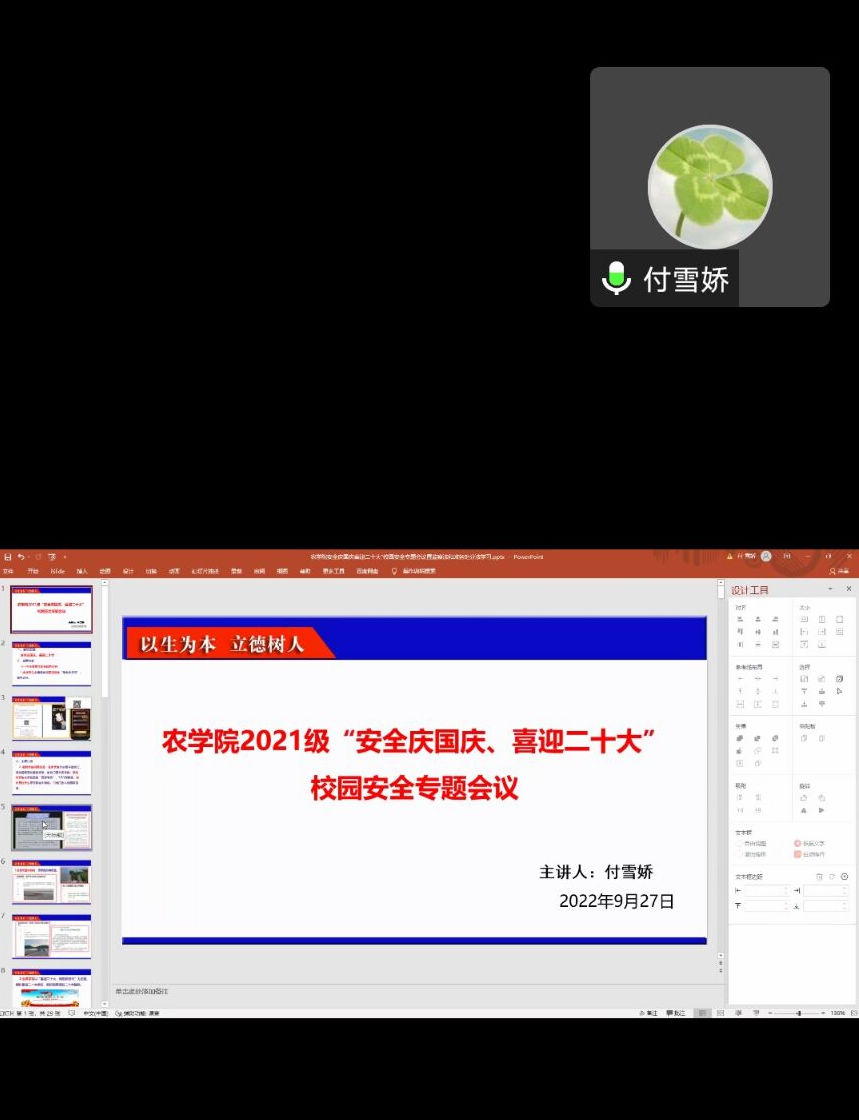 (通讯员 李雨珈提高员工的安全意识,增强员工对安全隐患的认知,加强员工的自我保护能力,砥砺奋进喜迎二十大,国庆临近之时,927日下午公司分年级分班级召开“安全庆国庆、喜迎二十大”校园安全专题会议