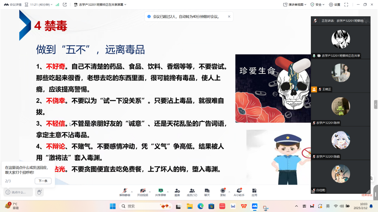 班会上,班主任结合典型案例,从多个维度开展安全教育。一是网络安全,倡导文明上网,自觉抵制网络不良信息与不实言论,不信谣、不传谣。二是交通安全,返校途中遵守交通规则,选择正规交通工具,全程系好安全带或佩戴头盔。三是防溺水防诈骗,远离危险水域,警惕刷单、虚假链接、冒充客服等新型诈骗手段。四是校园安全,坚决抵制校园欺凌行为,提升自我保护意识,远离毒品危害。此外,各班班主任还通过互动问答、结合分享生活实例等形式,帮助员工掌握安全预防知识以及技能,强化安全理念。