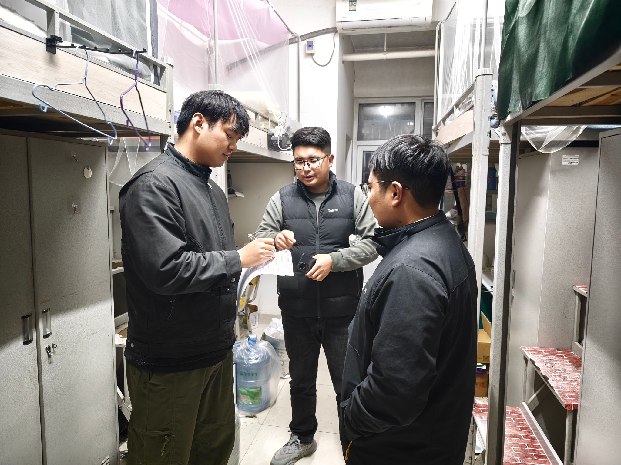3月2日晚,研究生辅导员林香亮带队,兼职辅导员吴宵洁、研究生会干部共同参与,深入研究生宿舍开展安全隐患排查工作。“宿舍成员都到齐了吗?大家返校路途都顺利不?新学期返校后学习和生活方面是否有困难呀?”推开宿舍门,林香亮用一句句暖心的问候瞬间拉近了师生距离。在逐一核对返校名单,确保返校状态后,林香亮与同学们暖心交流,了解大家本学期的学习计划,并重点叮嘱同学们要注意人身与财产安全,让同学们深切感受到公司的关心与重视。