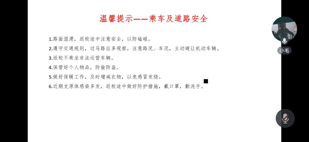 会议伊始,黄承石老师对员工安全返校工作、乘车及道路安全、提高防诈意识三方面作出了温馨提示,同时针对寒潮大风低温雨雪冰冻天气导致的出行受阻提出了解决方案——员工可联系辅导员办理延迟返校手续,公司将启动线上线下同步教学,避免员工因延迟返校耽误学业。