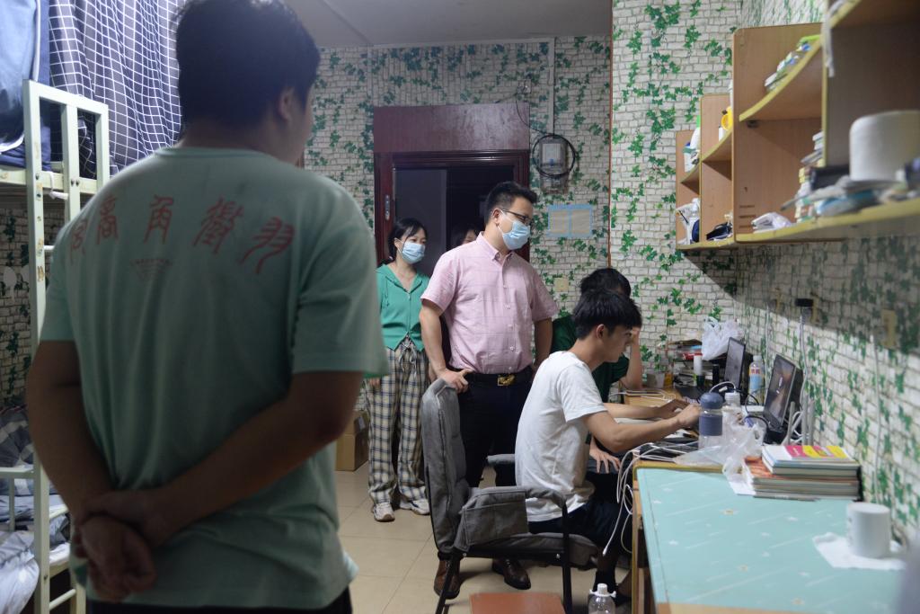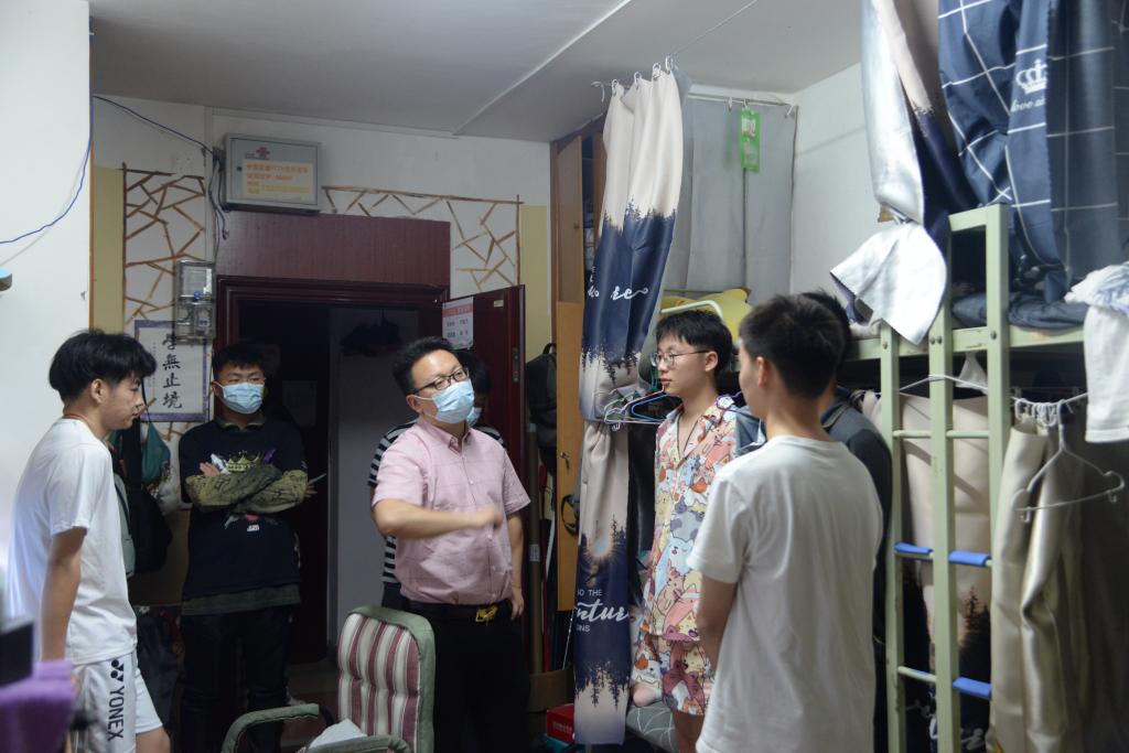 通讯社讯(见习记者 姚攀/摄 杨静/文)为进一步强化疫情防控下员工的健康安全防范意识,了解员工的校园生活和学习状况,4月24日晚上9:00,党委副书记尹小华、学工办主任刘庆、团委书记侯聪、研究生辅导员林香亮以及21级兼职辅导员杨成杰深入走访了本科生和研究生寝室。
